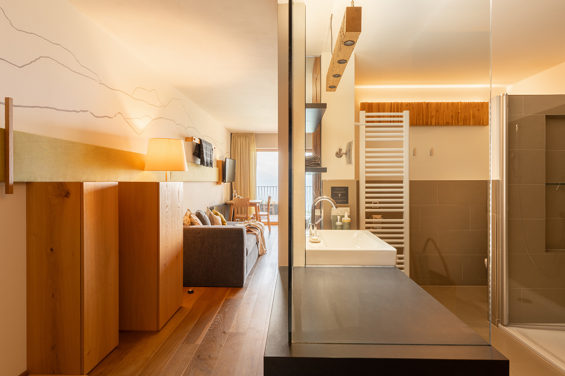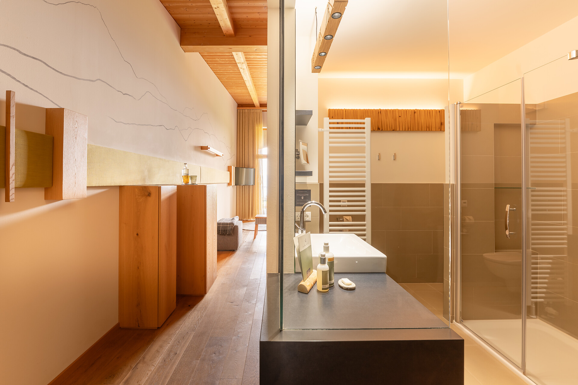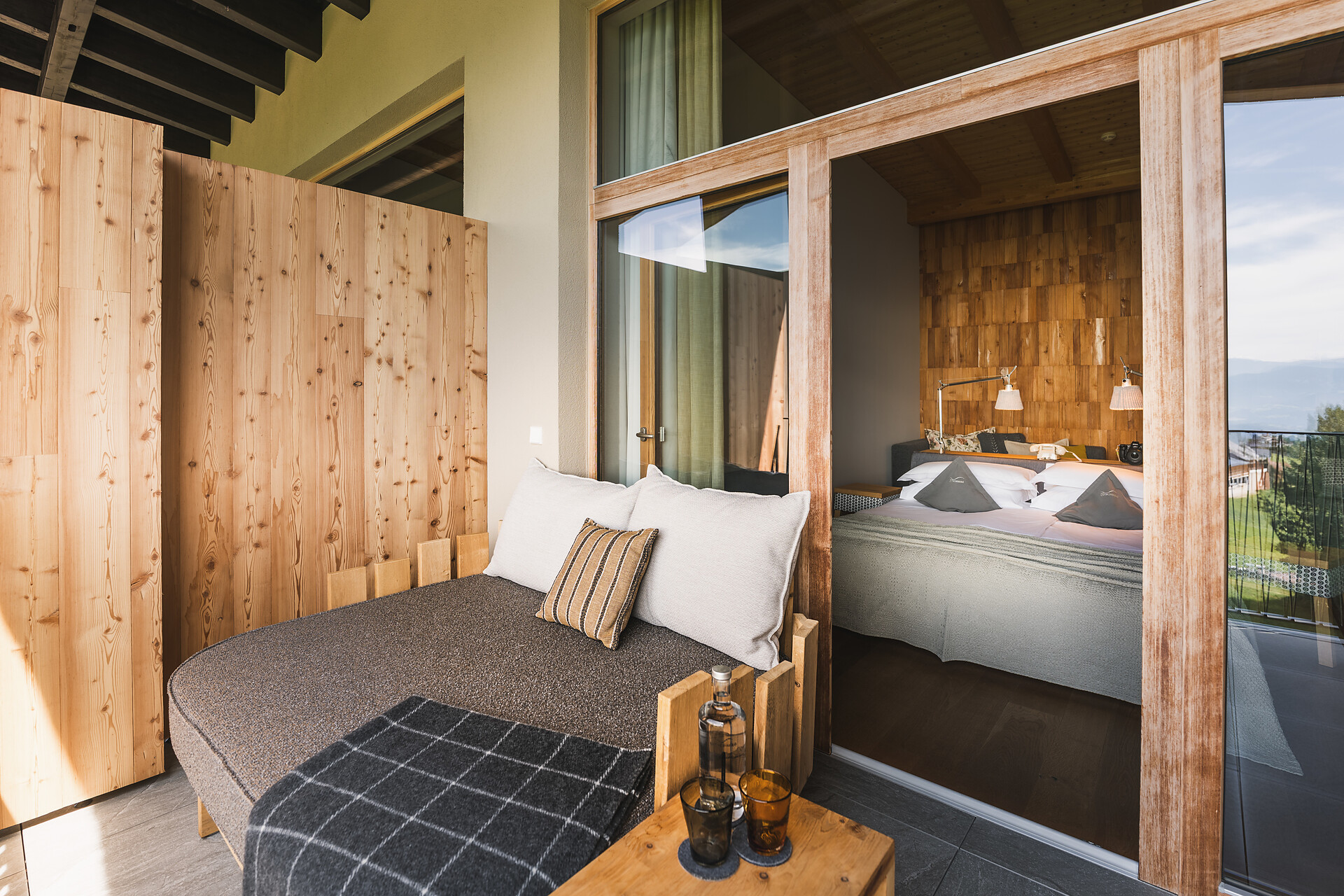 Suite esclusiva ispirata alla natura, design in legno di larice e pregiata quarzite argentea. Esposta a nord, con vista sui prati di montagna, per un’affascinante atmosfera raccolta e tanta intimità. Lounge con angolo degli infusi, fontanella con acqua di sorgente e biblioteca. Bagno wellness con grande doccia, vasca con selezione di sali e zona WC/bidet separata. Ampia loggia di 14 m2 con spa: sauna privata di pino cembro, oli essenziali e sentiero multisensoriale.