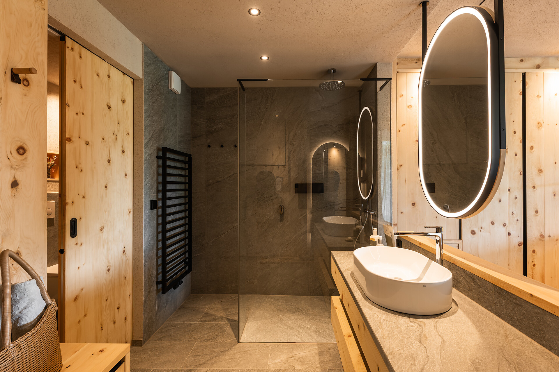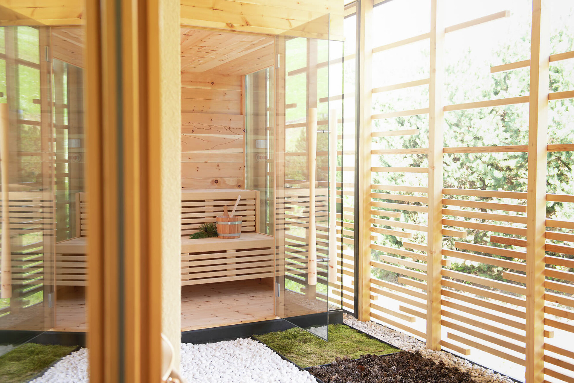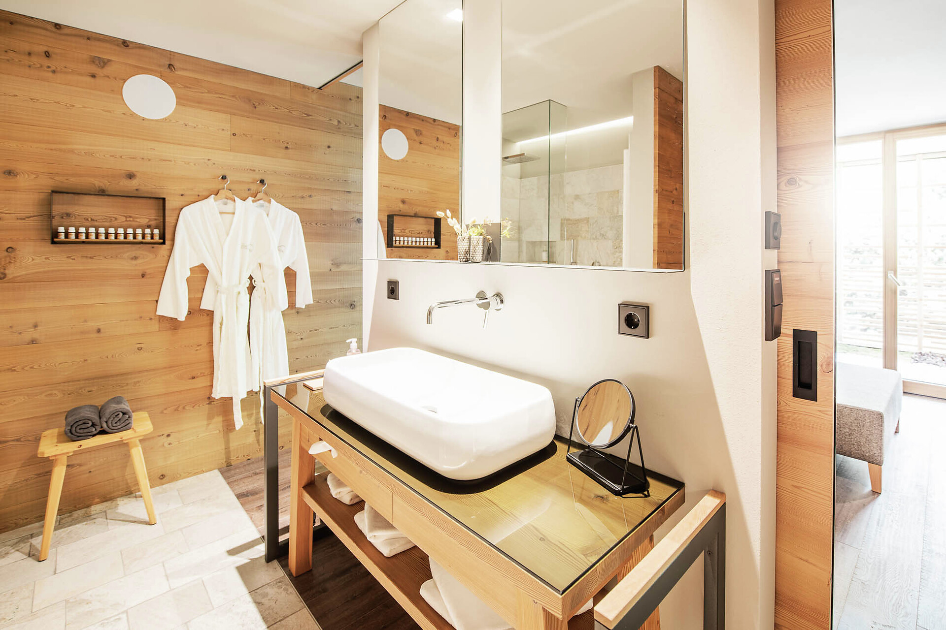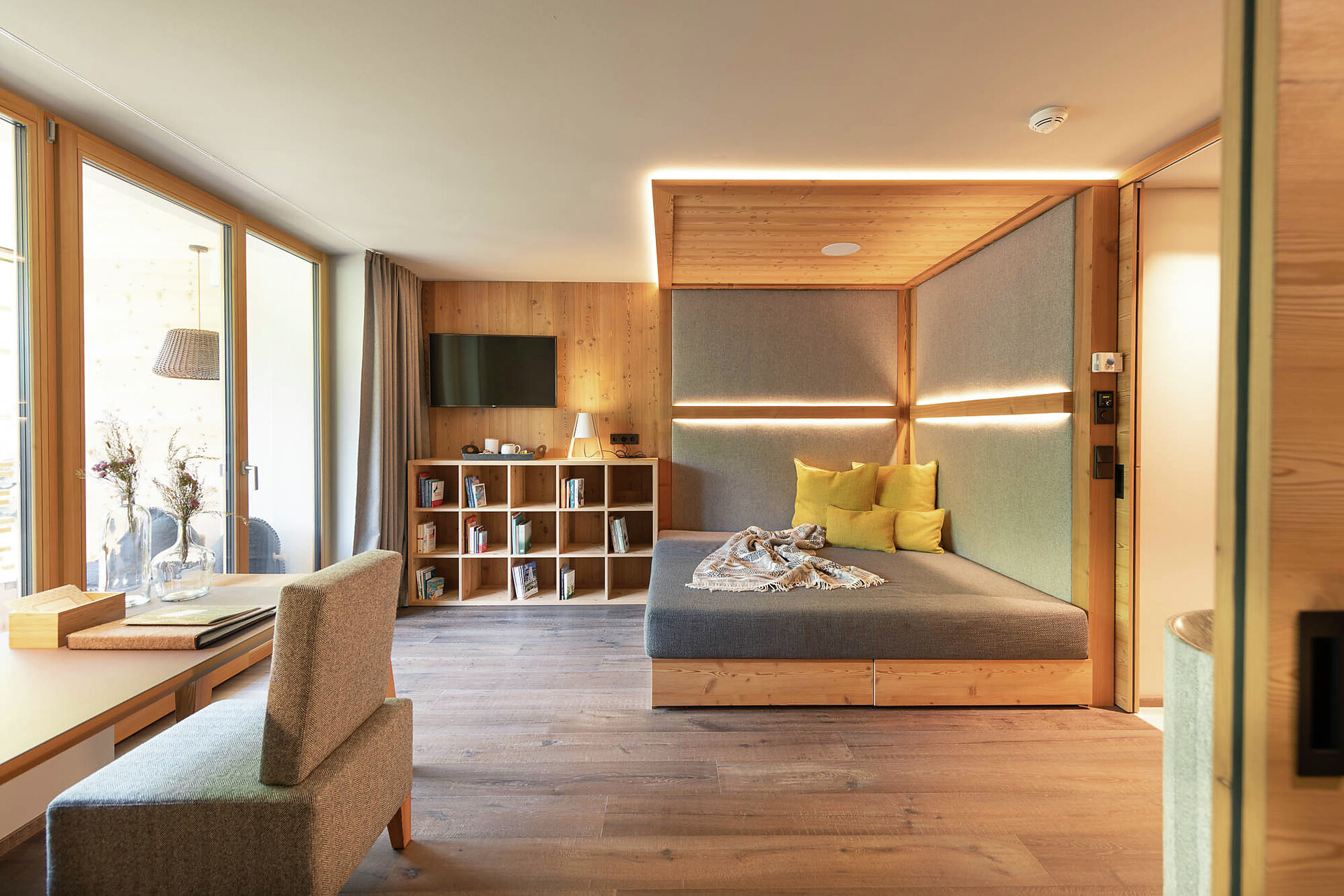 Suite esclusiva ispirata alla natura, design in legno di larice e pregiata quarzite argentea. Esposta a nord, con vista sui prati di montagna, per un’affascinante atmosfera raccolta e tanta intimità. Lounge con angolo degli infusi, fontanella con acqua di sorgente e biblioteca. Bagno wellness con grande doccia, vasca con selezione di sali e zona WC/bidet separata. Ampia loggia di 14 m2 con spa: sauna privata di pino cembro, oli essenziali e sentiero multisensoriale.