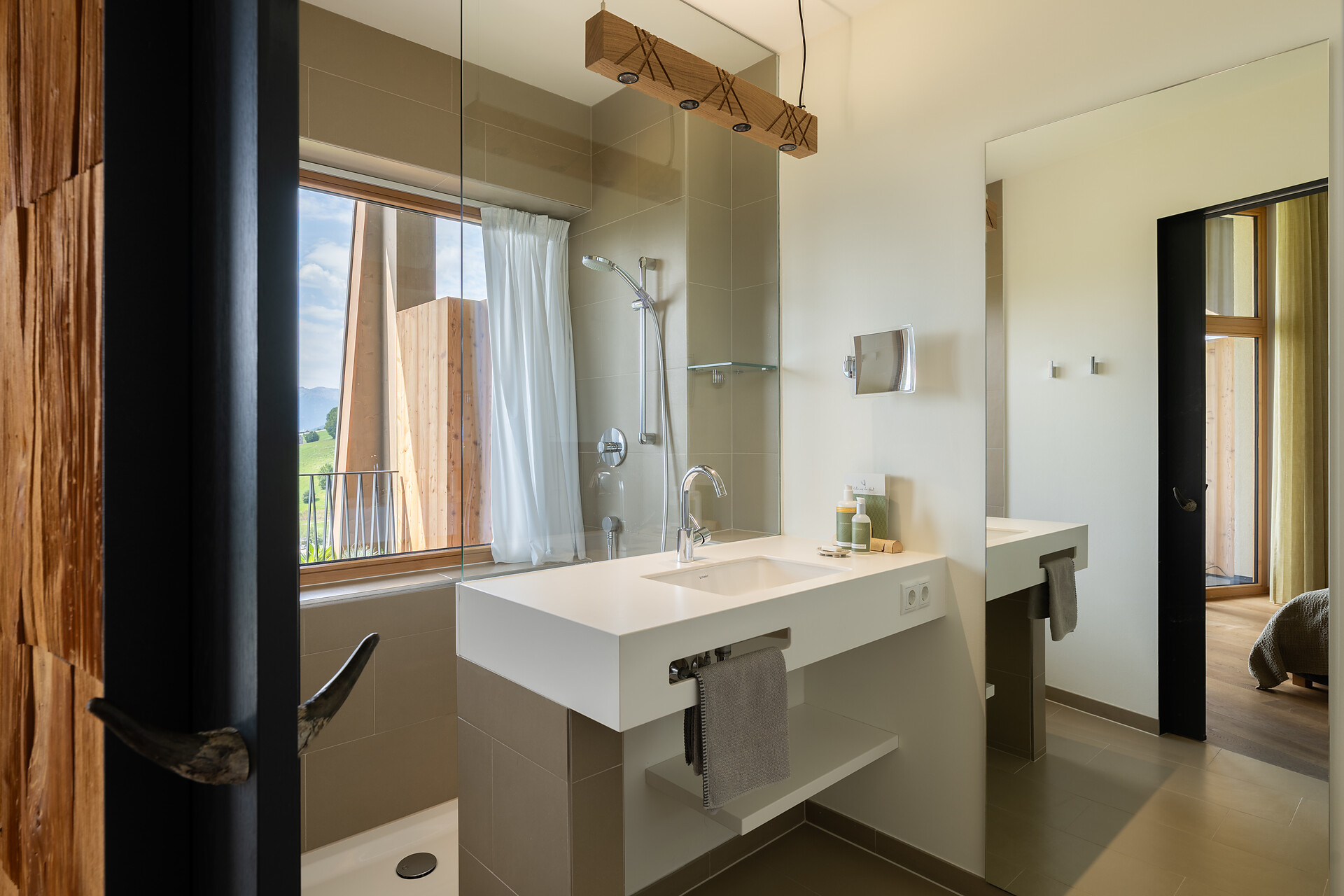 Nuova camera ispirata alla natura, inondata di luce, con design in caldo legno di larice. Loggia di 8m2, esposta a sud, per rilassarsi al sole con vista sulle Dolomiti. Sistema letto ortopedico-bioenergetico d’alta qualità. Bagno open space tutt’uno con la camera, zona WC e bidet separata.