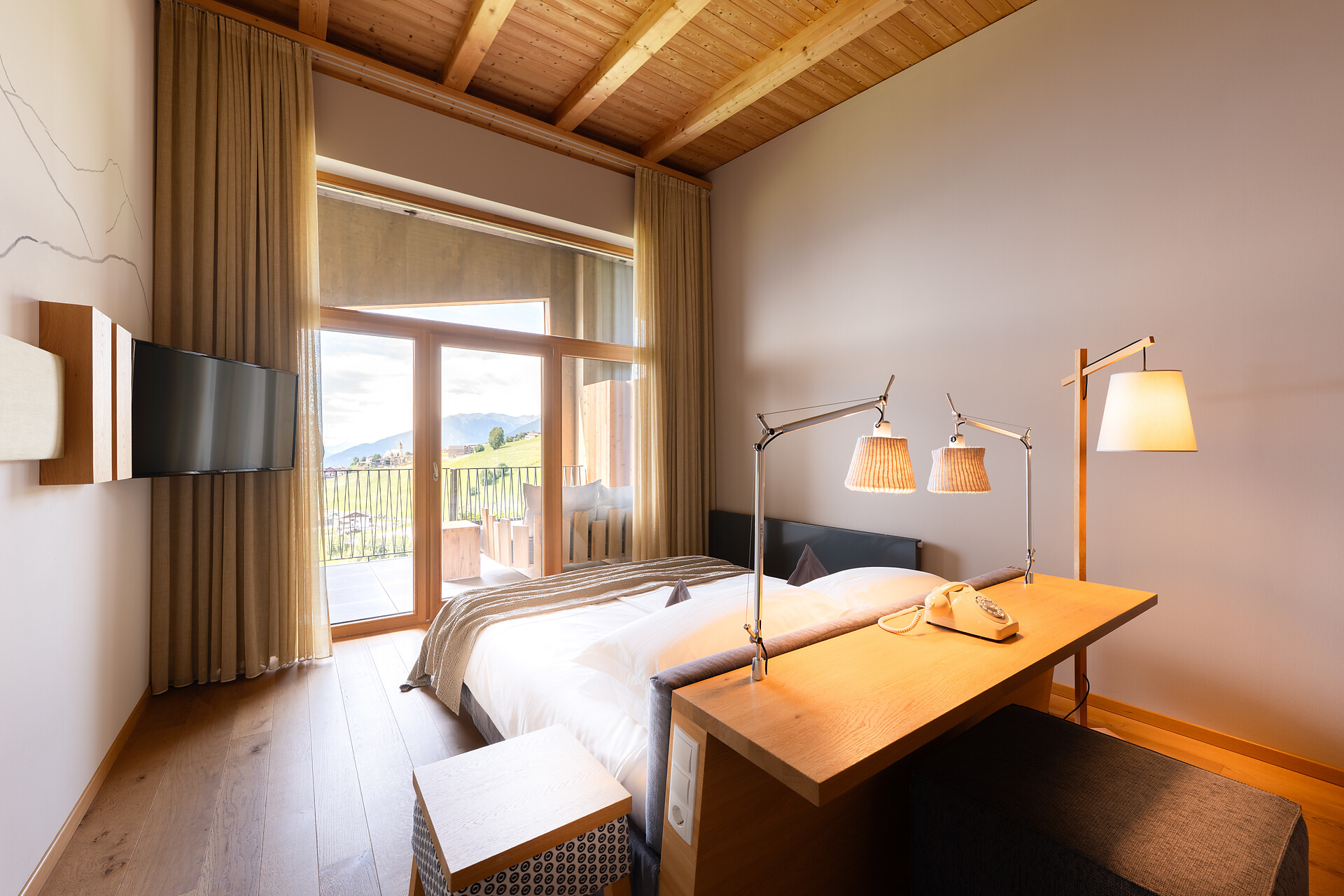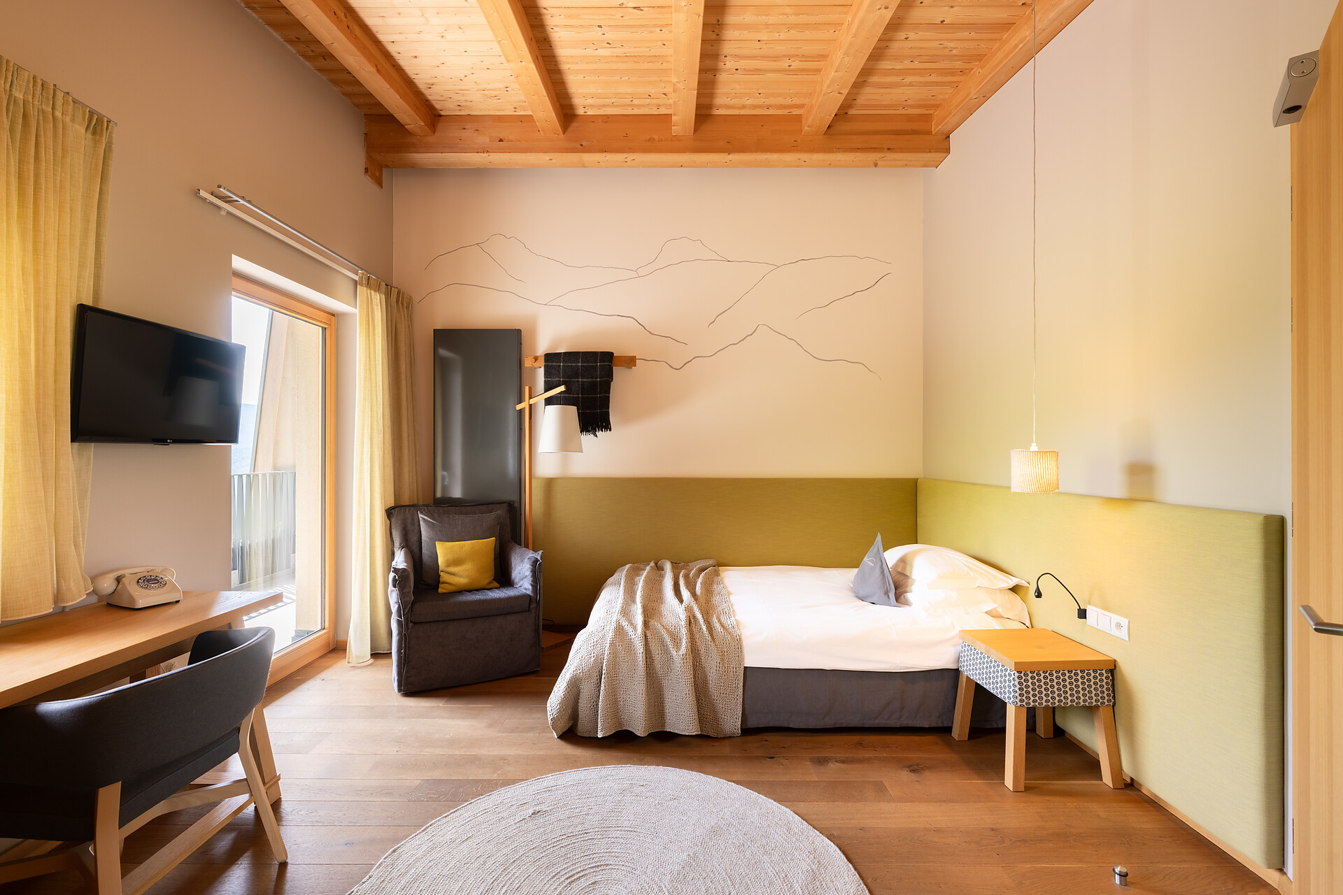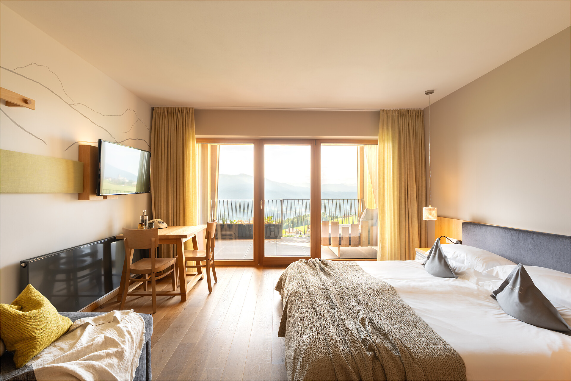 Camera panoramica ricca di fascino e stile, all’ultimo piano. Balcone di 16m2, esposto a est e a sud, con sole al mattino e grandiosa vista sulle Dolomiti. Sistema letto ortopedico-bioenergetico d’alta qualità. Letto alla francese 140x210.