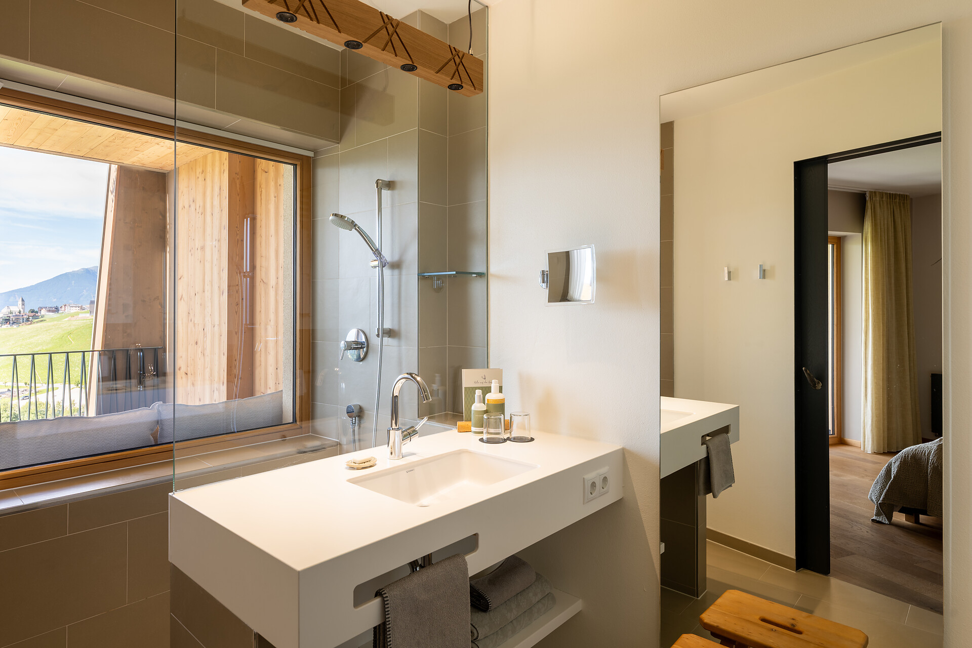 Nuova camera con materiali bio e design in legno di pino cembro locale, benefico per la salute. Loggia di 9m2, esposta a sud, per rilassarsi al sole con vista sulle Dolomiti. Allestita come Power Sleeping Room® con il sistema letto bioenergetico con effetto earthing di Samina. Bagno wellness open space tutt’uno con la camera, con doccia, vasca freestanding, zona WC e bidet separata.
