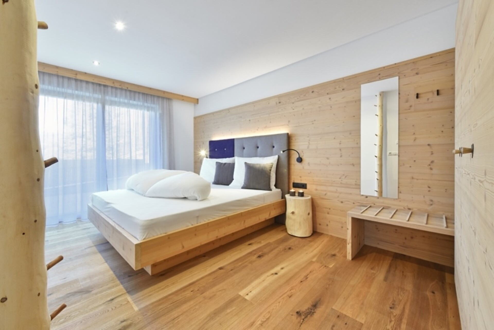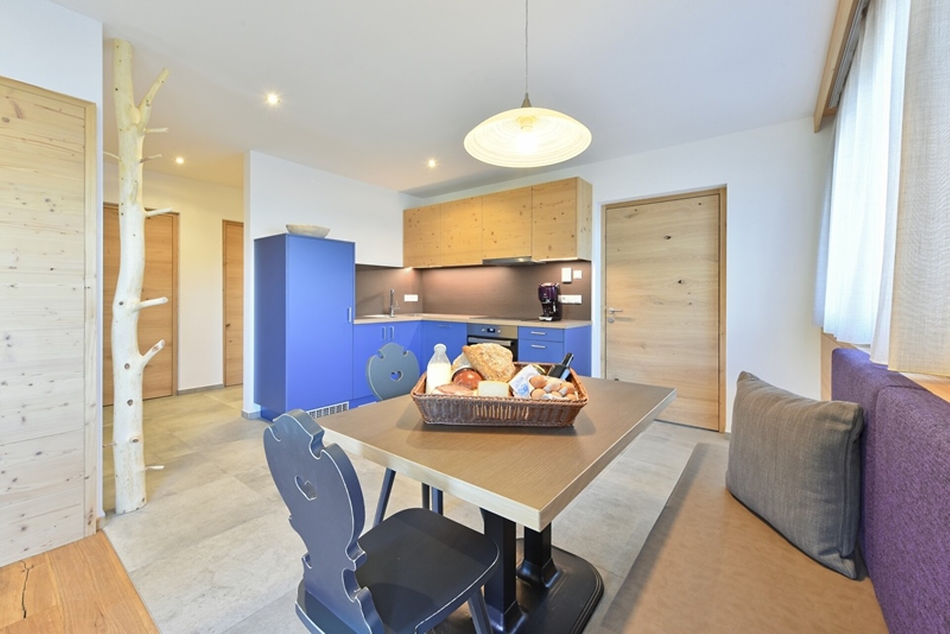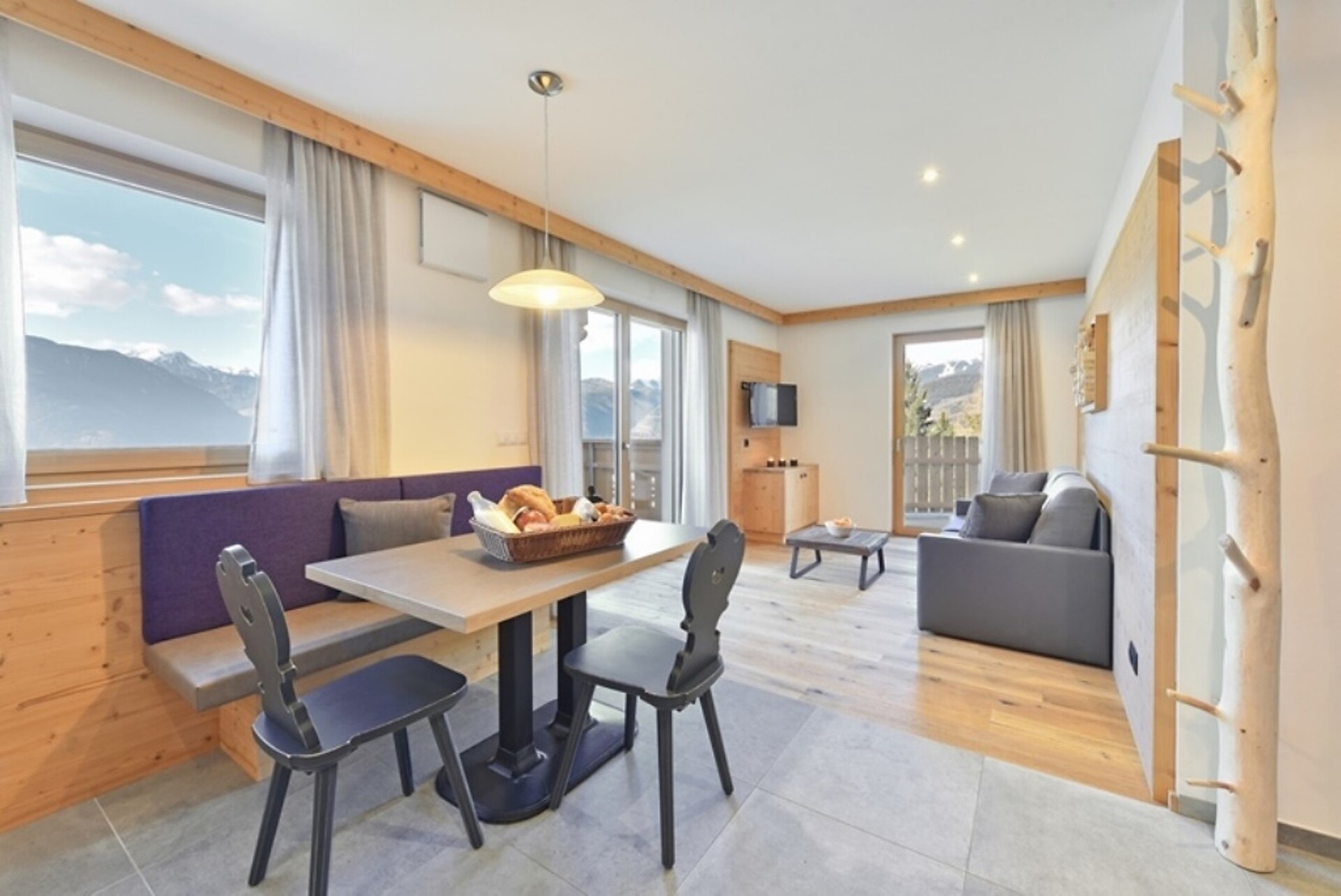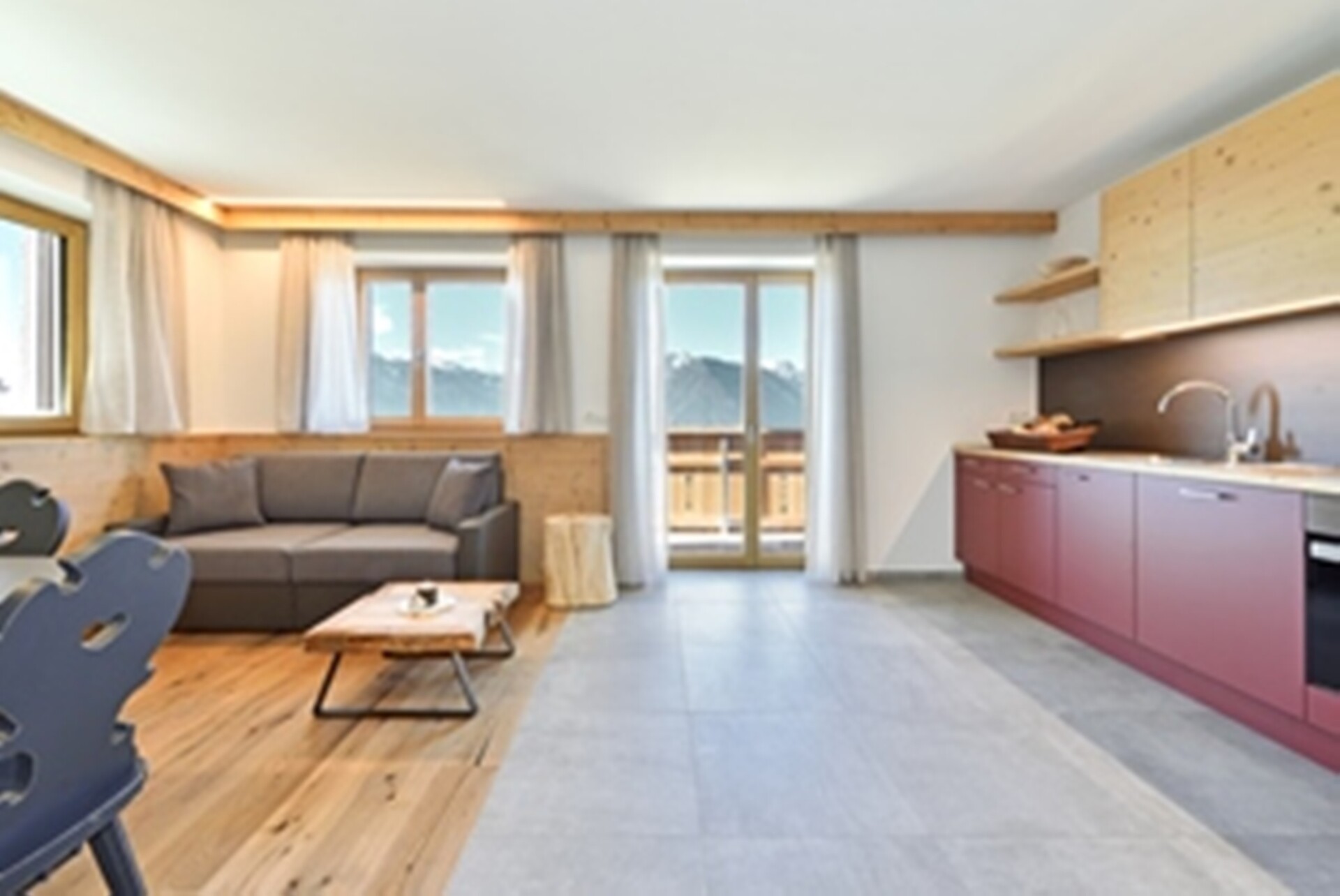 2 camere da letto separate, cucina completamente attrezzata, soggiorno aperto, bagno con lavatrice propria, ampia terrazza di 60 m² con lettini in pino cembro e balcone con vista sul panorama montano e sul Castello di Rodengo.
