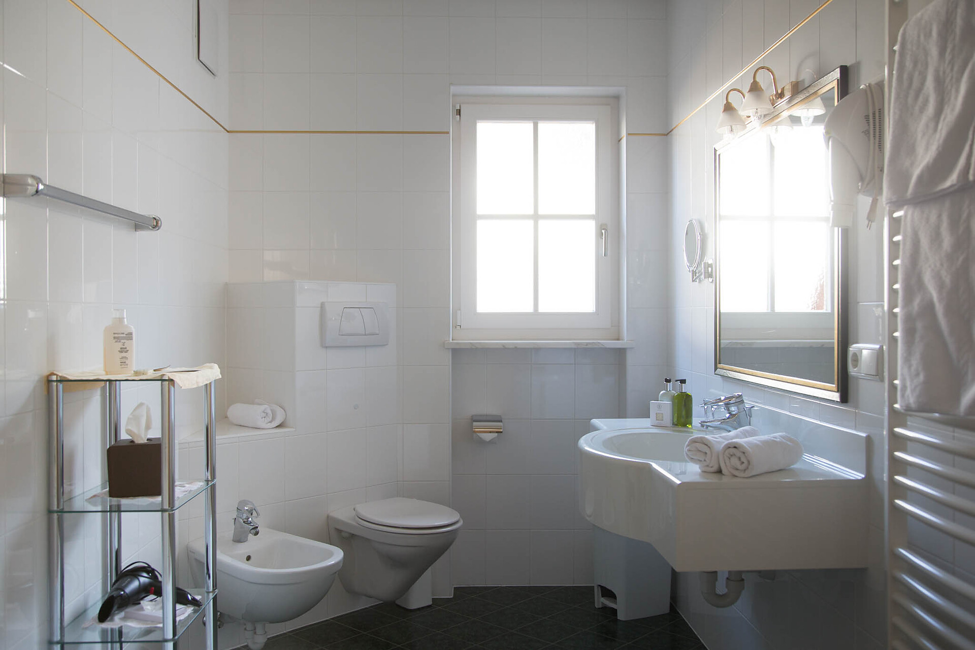 Camera doppia ammobiliata con balcone esposto a sud e bagno con vasca, WC e bidet. È disponibile anche una macchina Nespresso.