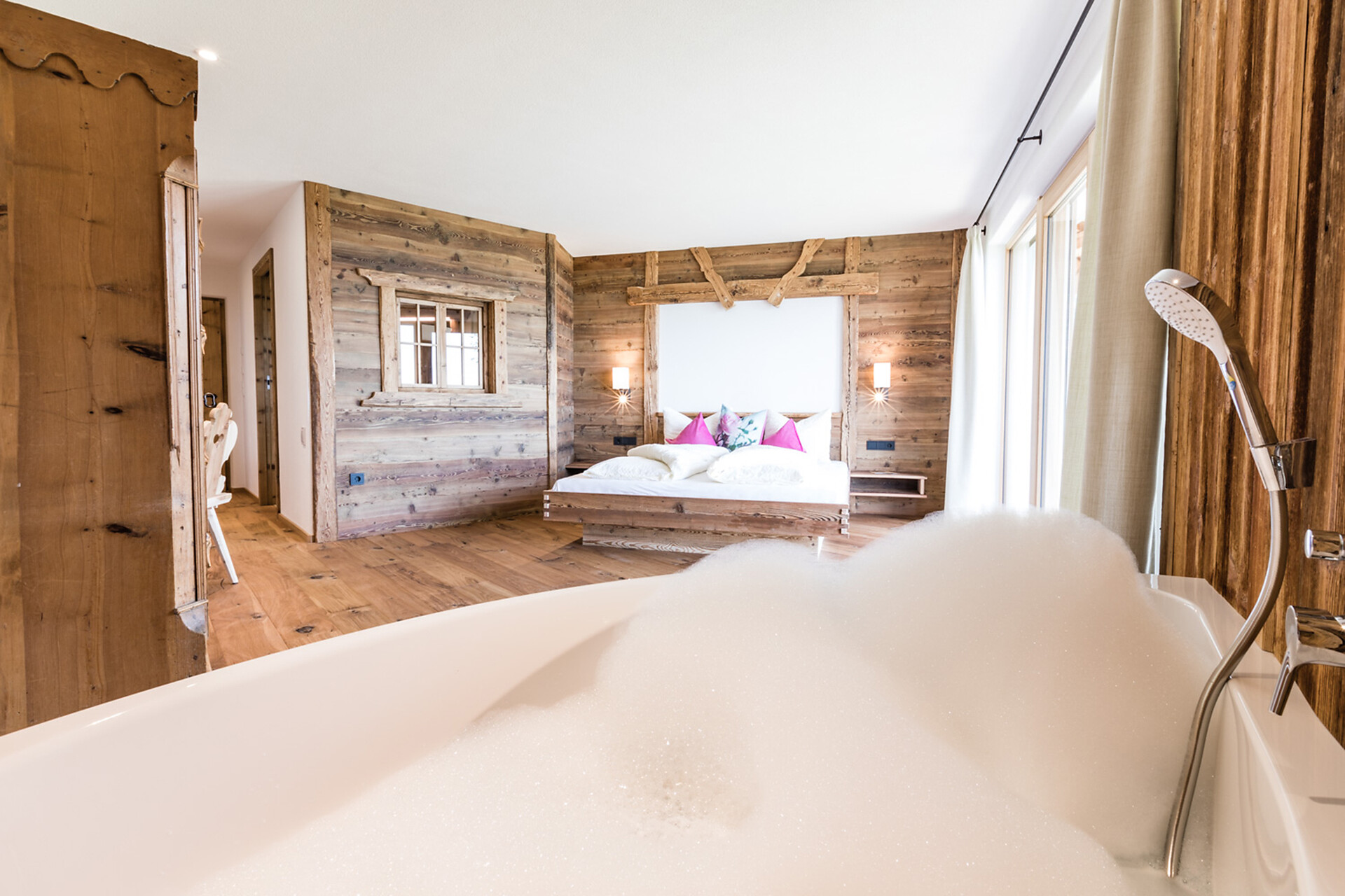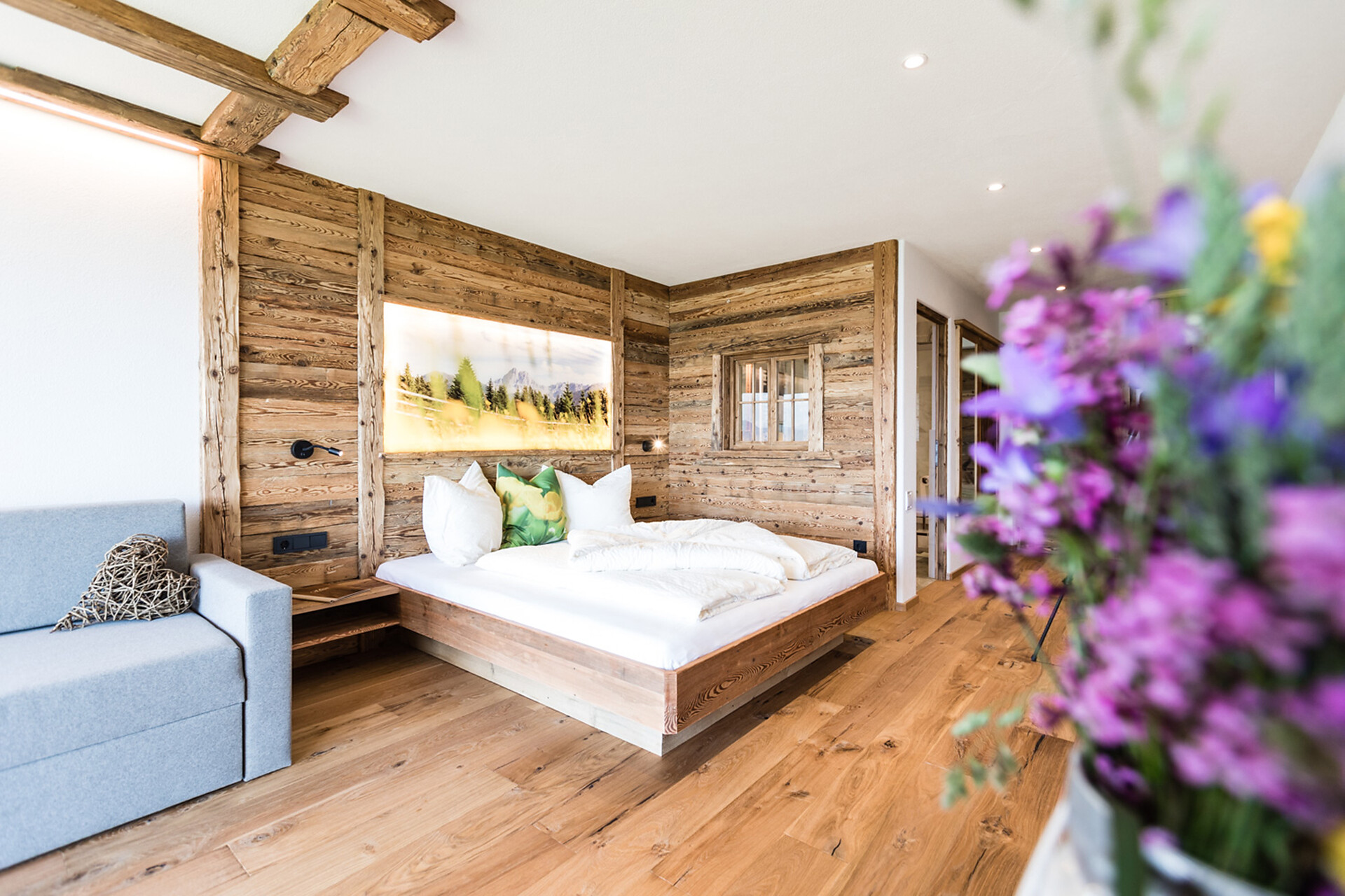 Cosa c’è di meglio che ammirare il sole diffondere la sua luce sulla facciata in vetro larga quasi 4 metri e sentire il profumo del legno che pervade gli ambienti? Le nostre luminose suite si affacciano sul giardino e sono dei ritiri accoglienti dove ci si sente al sicuro – amorevolmente arredate all’interno con vecchie tavole in legno scurite dal sole che per decenni hanno rivestito le facciate del maso, sfidando vento e intemperie.