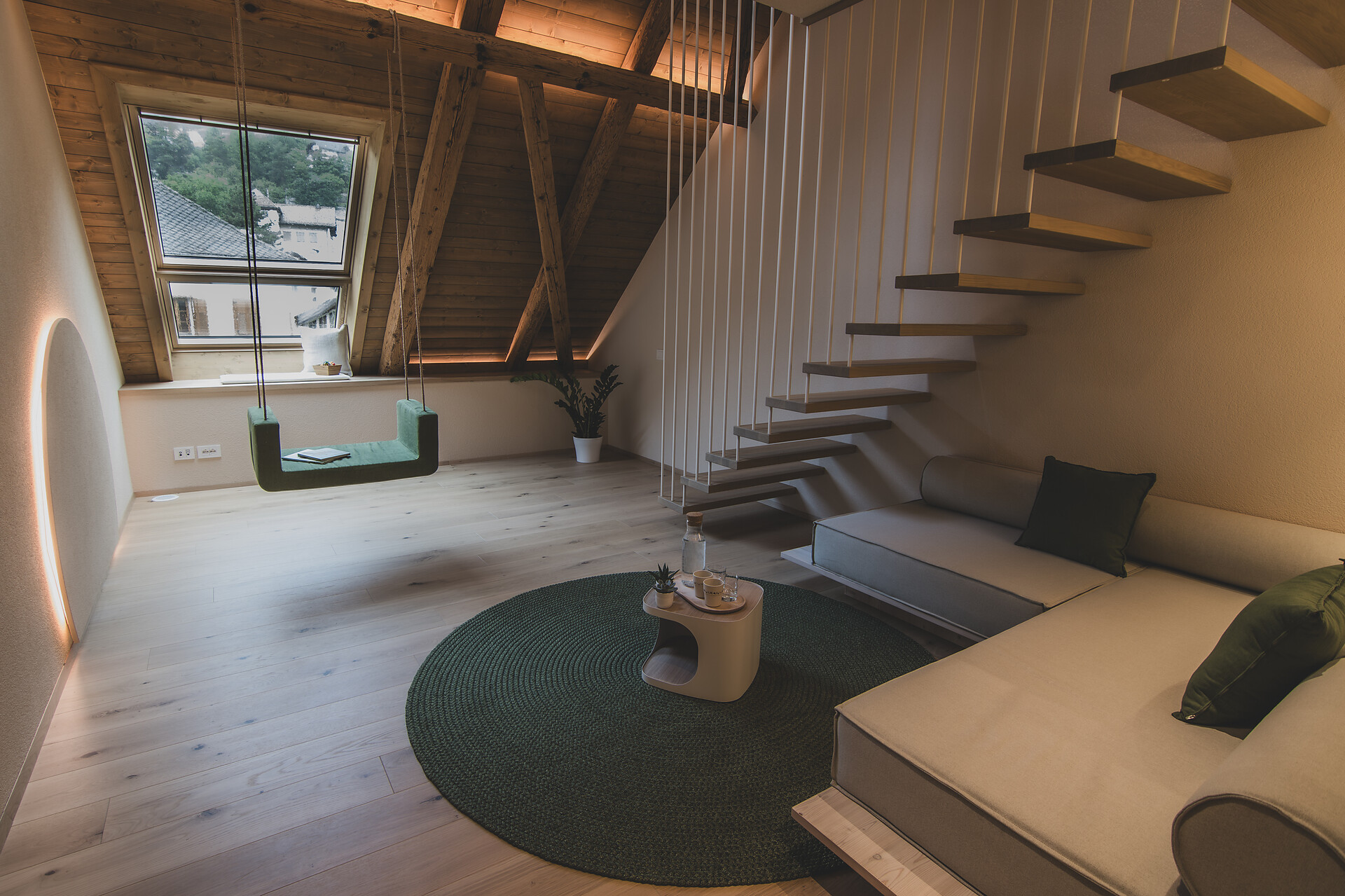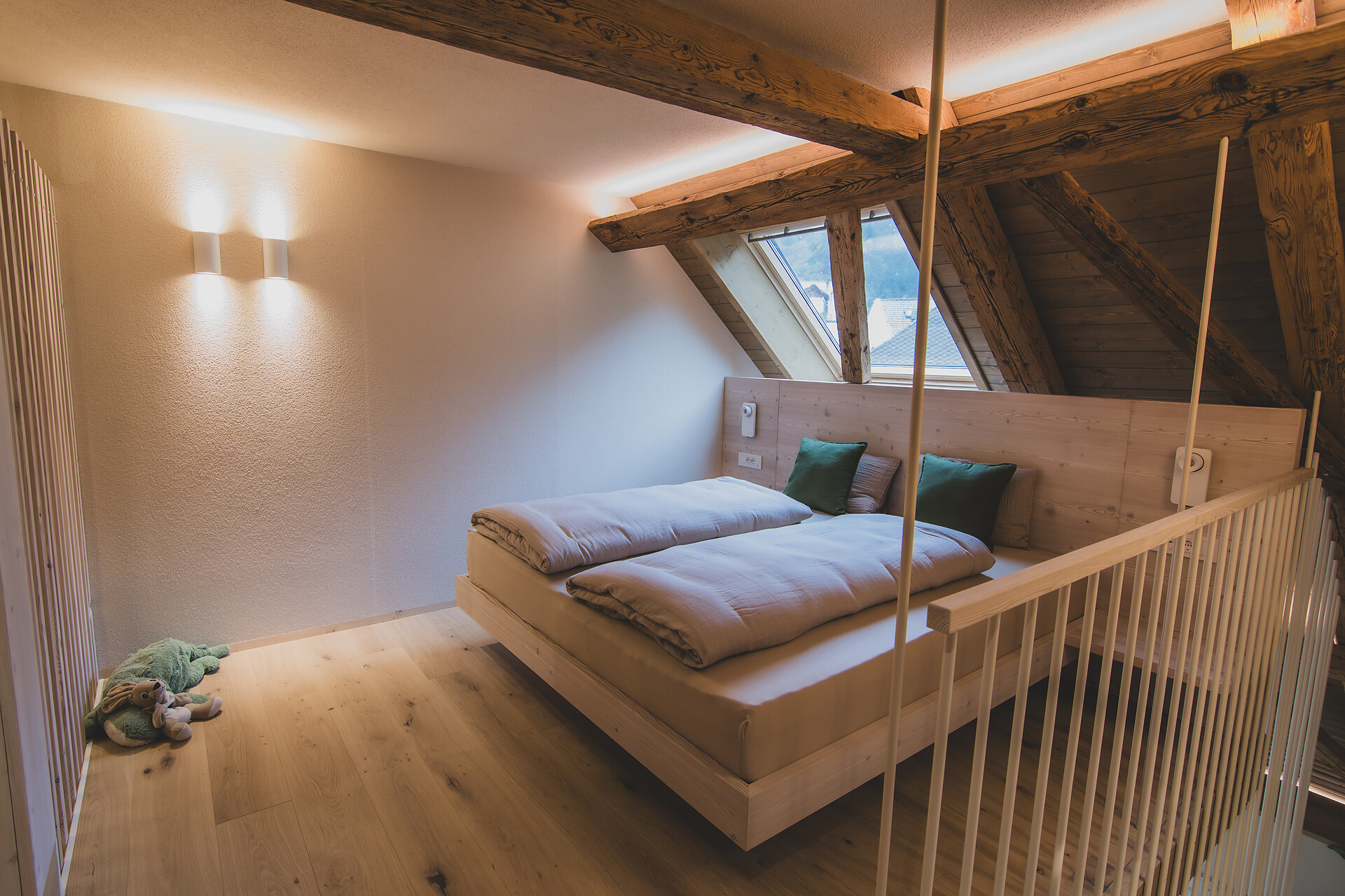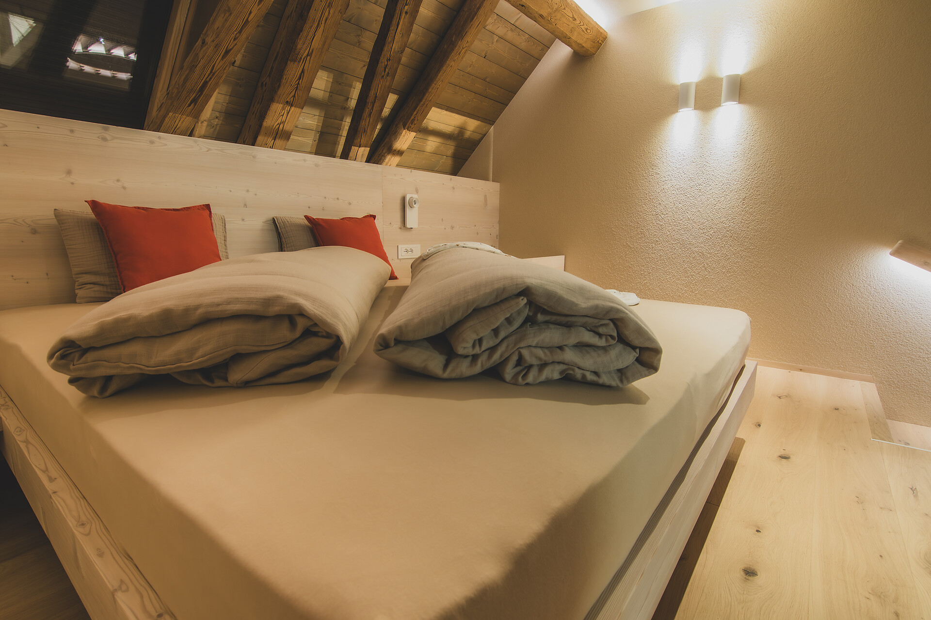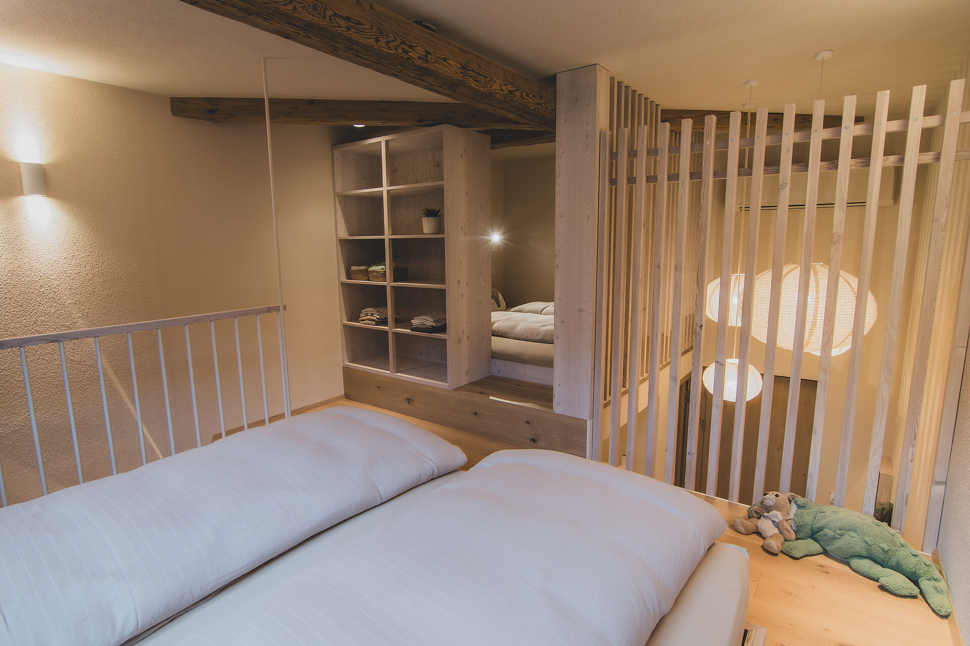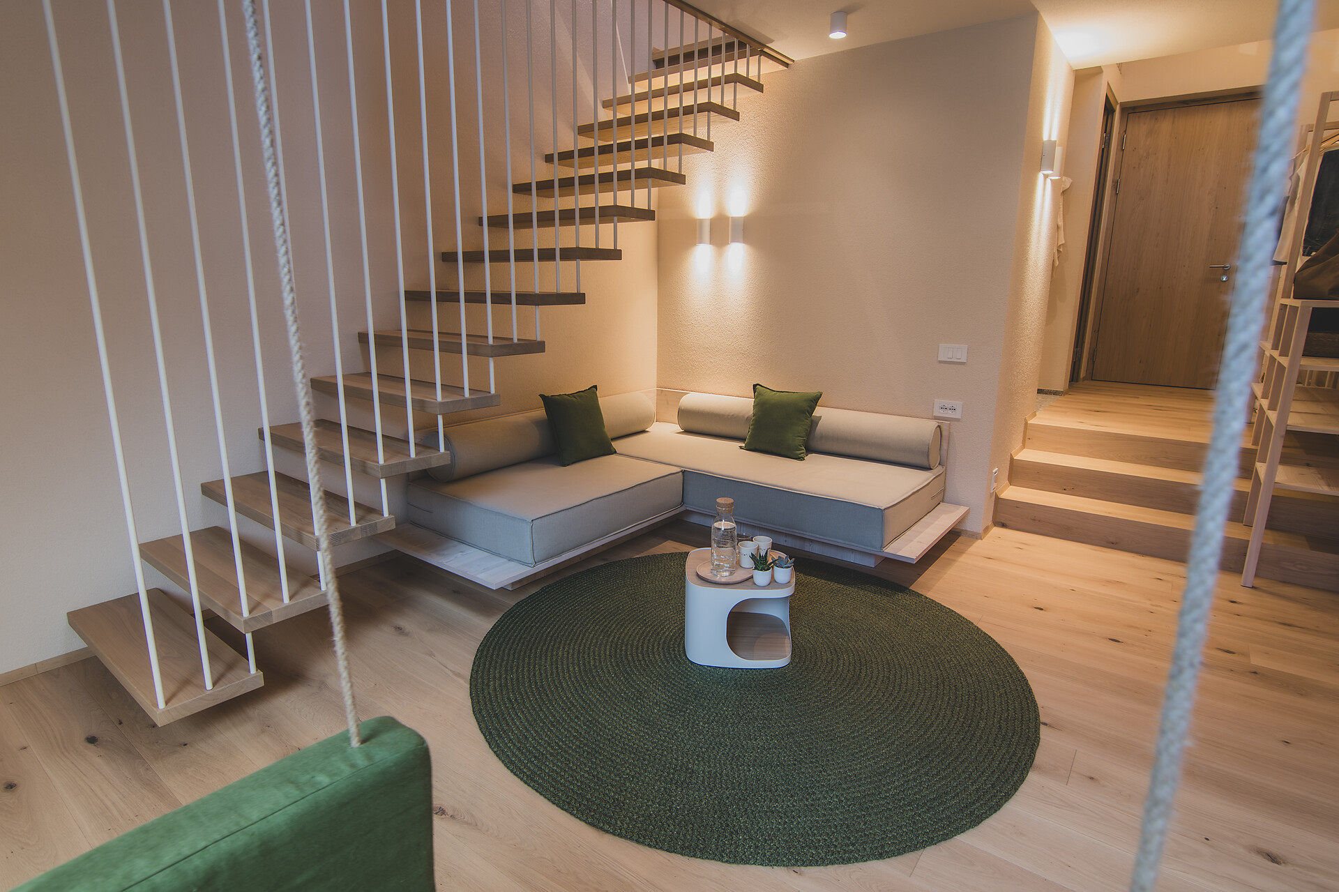Camera su 2 livelli ideale per famiglie con più bambini; scala a libero accesso nella zona notte; letto matrimoniale per i genitori e alcova con letto per i bambini; zona bagno e zona giorno a vista con divano e sedia a dondolo.