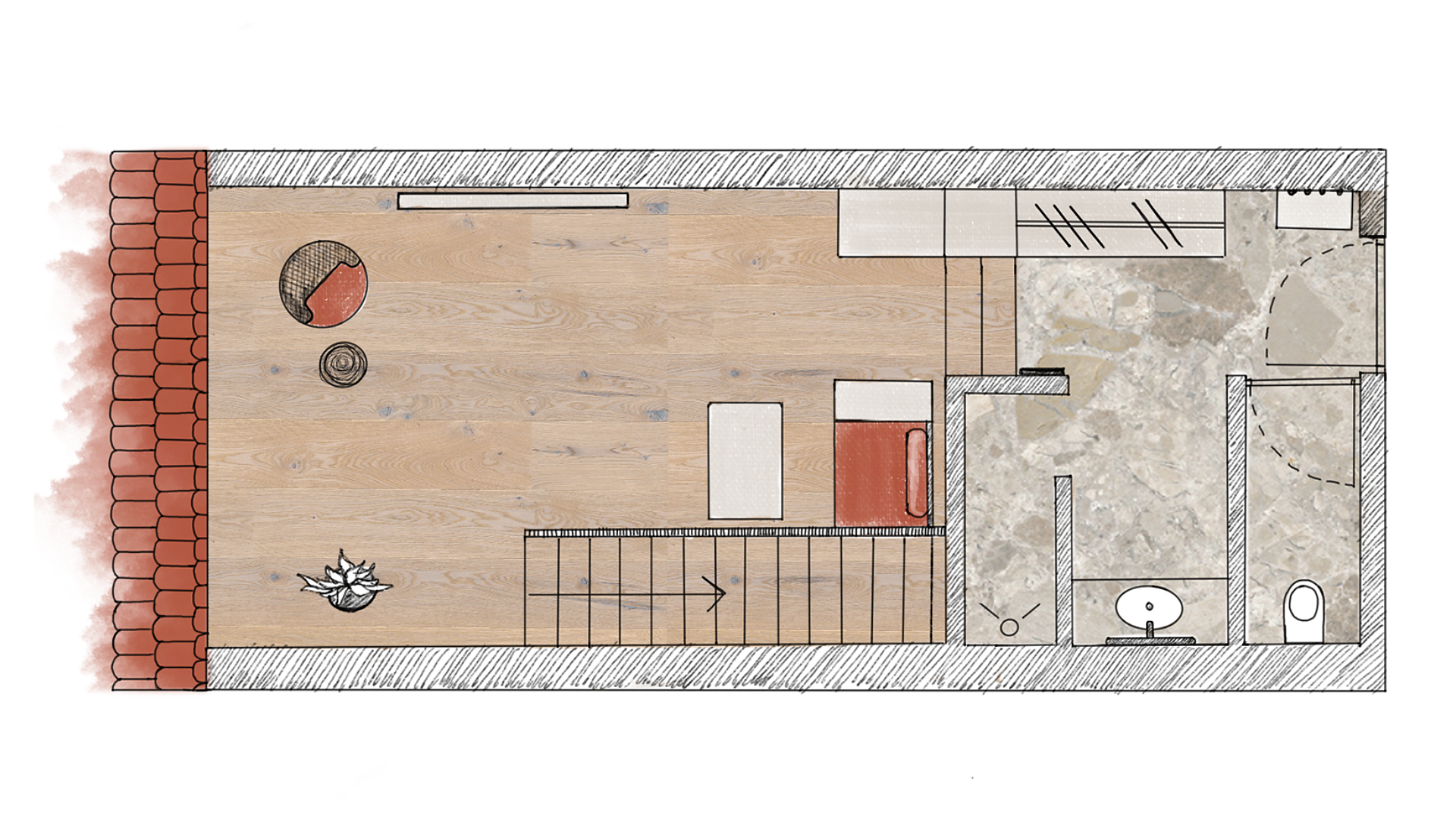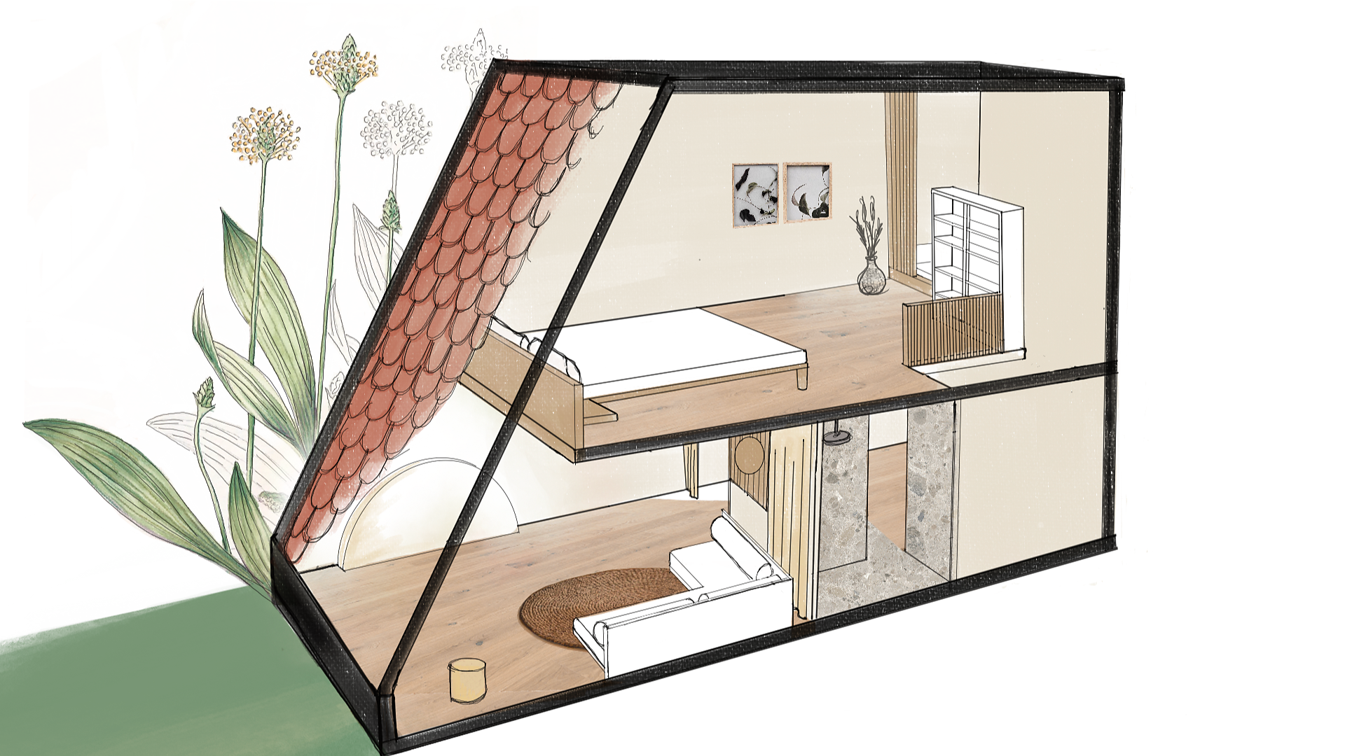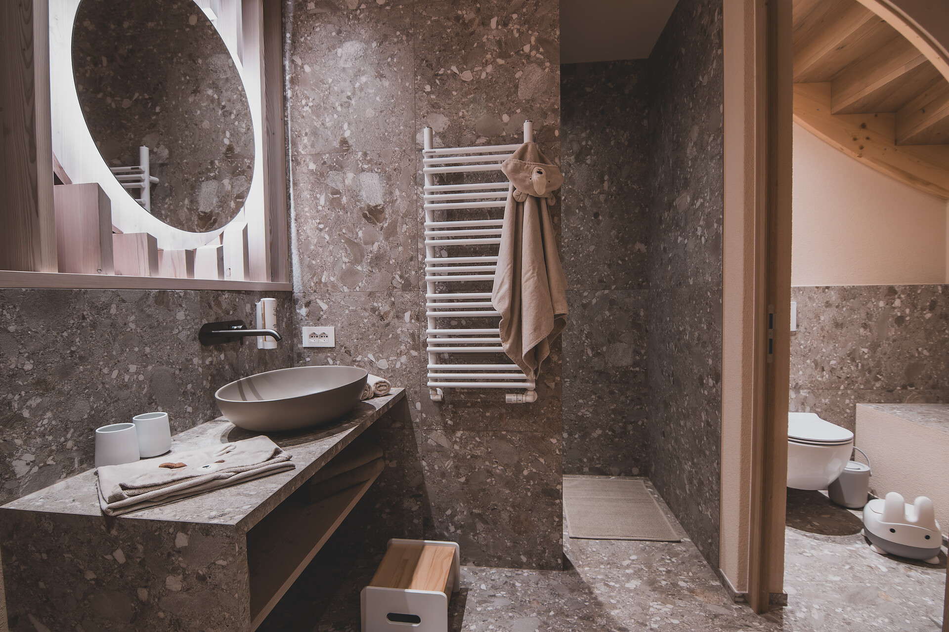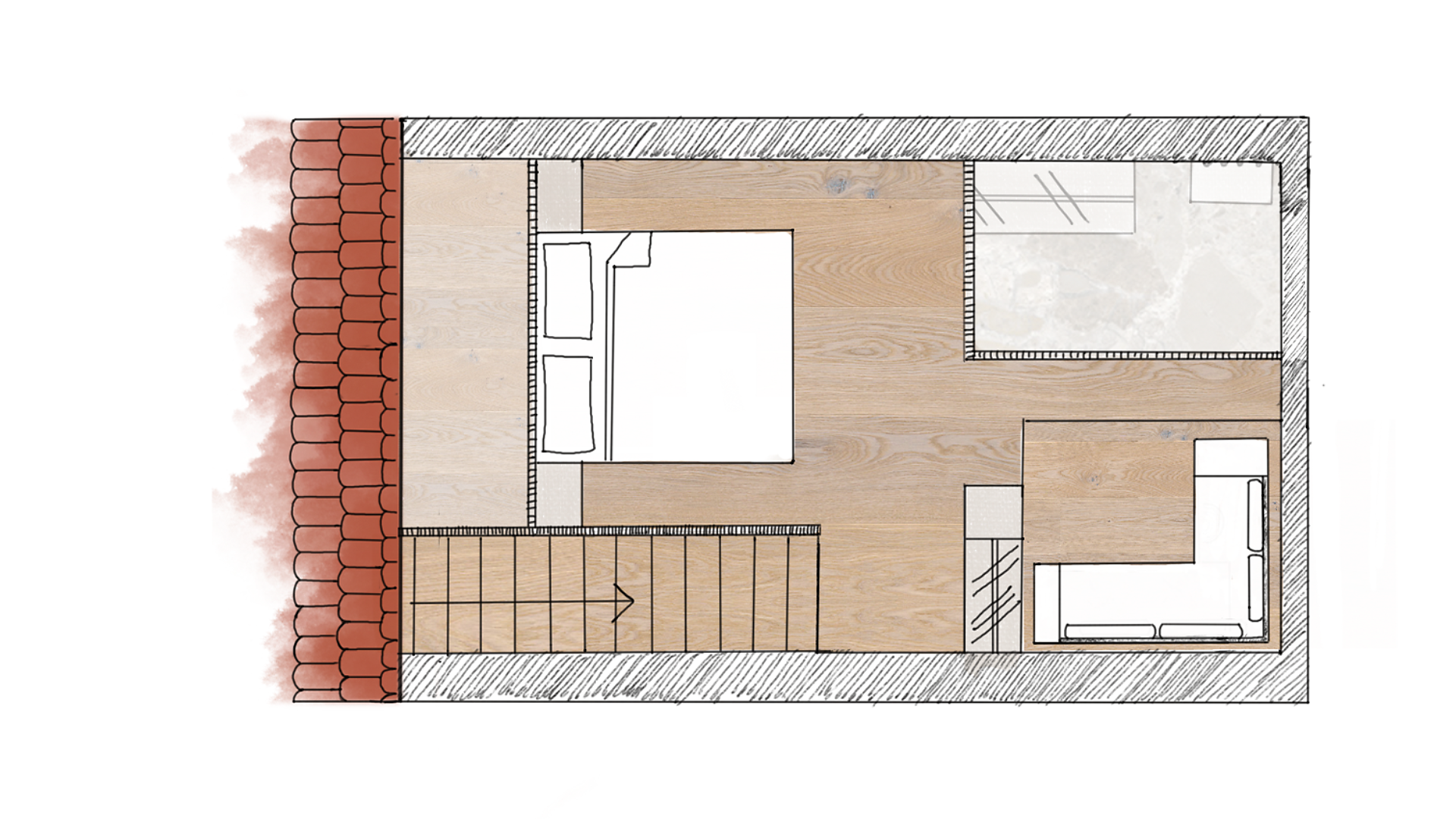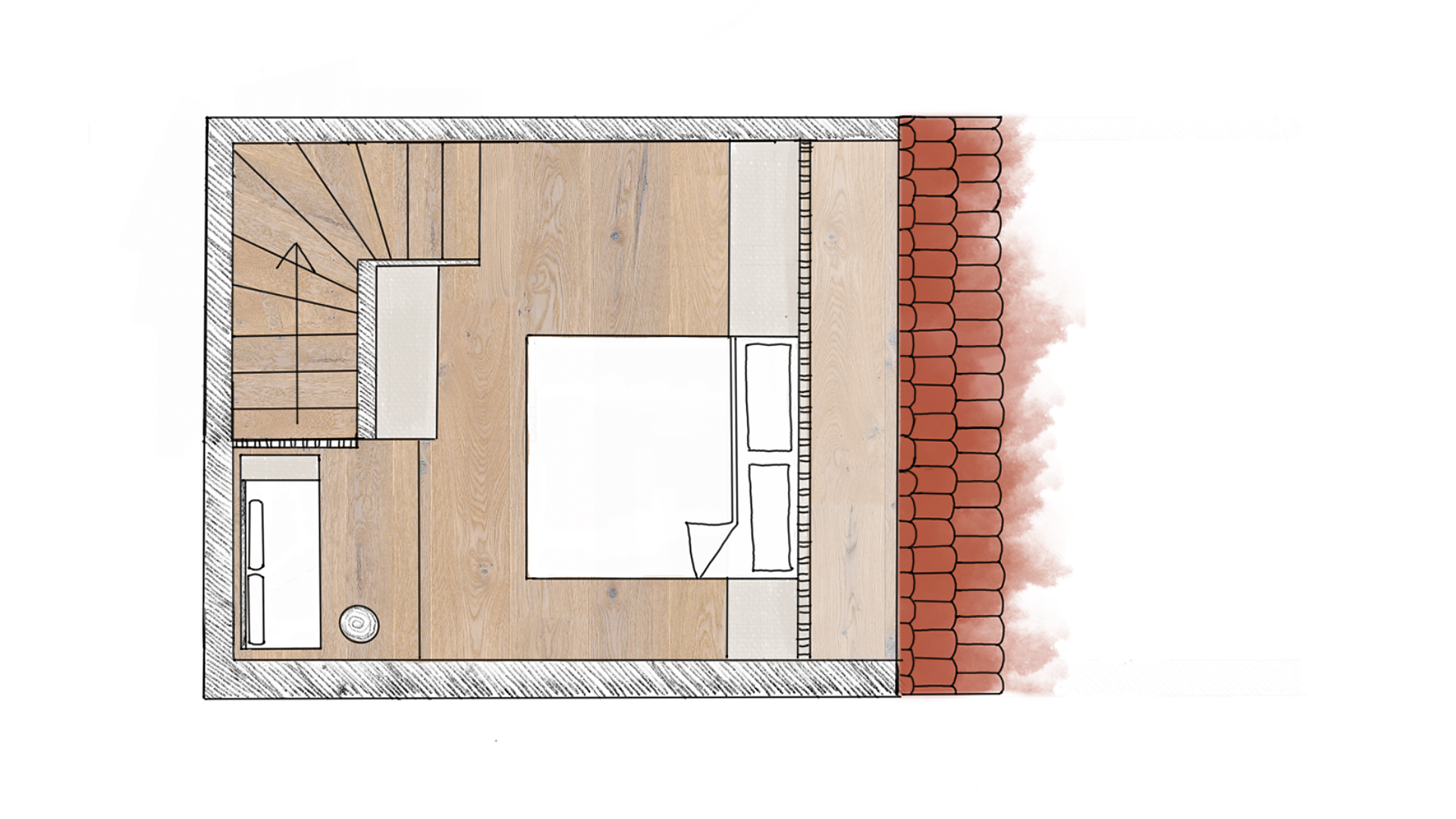 Camera su 2 livelli ideale per famiglie con più bambini; scala a libero accesso nella zona notte; letto matrimoniale per i genitori e alcova con letto per i bambini; zona bagno e zona giorno a vista con divano e sedia a dondolo.
