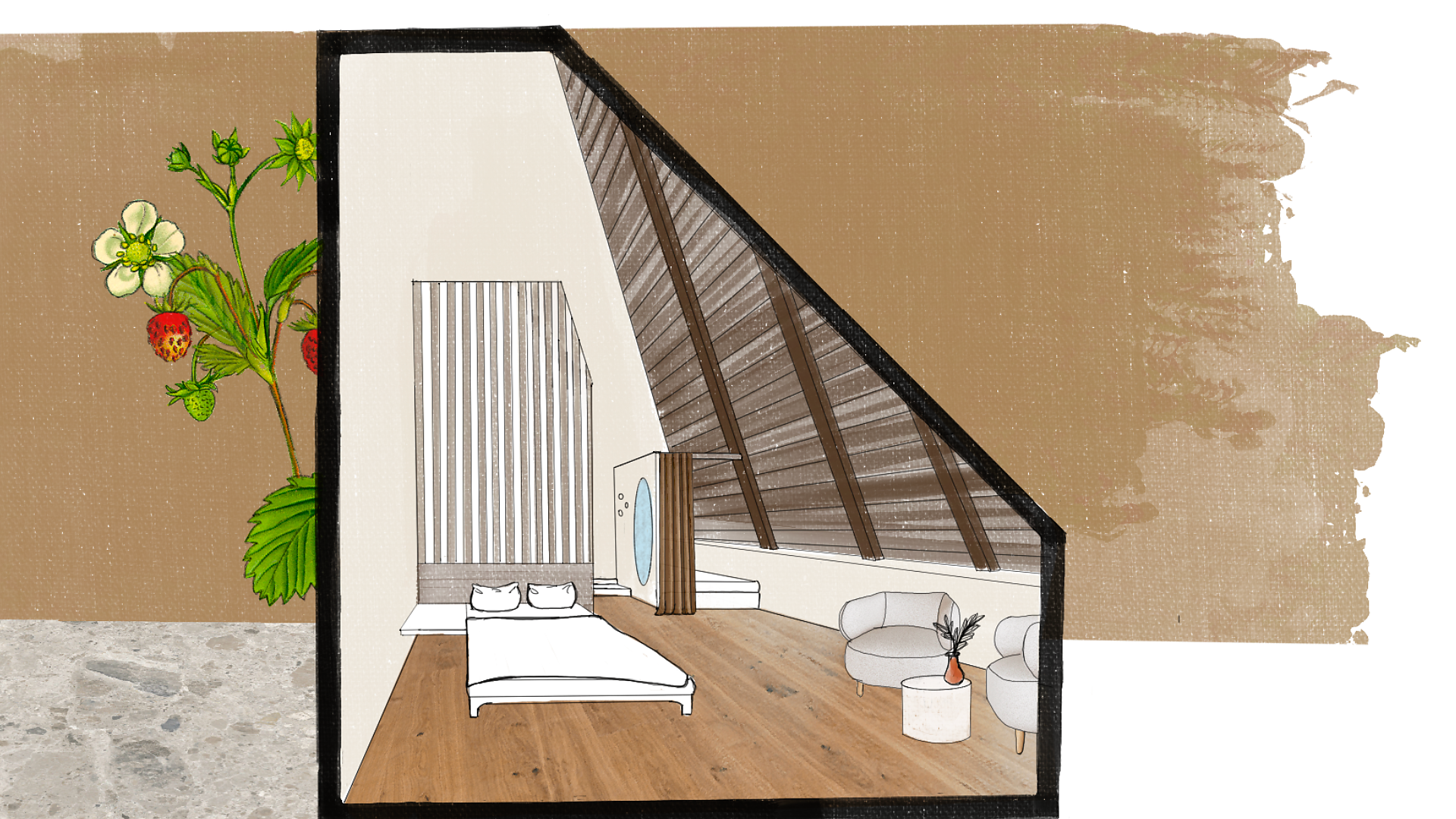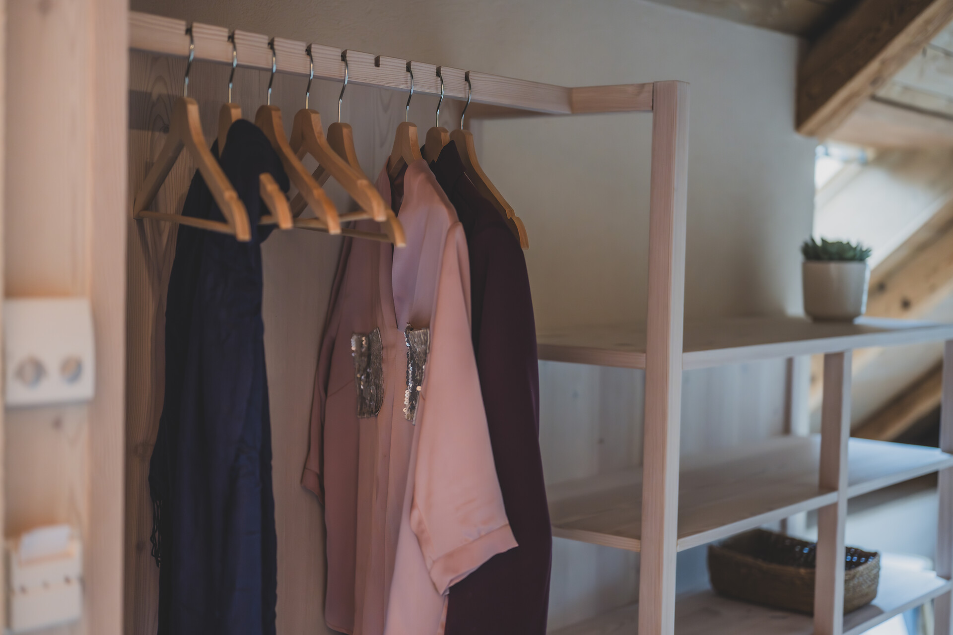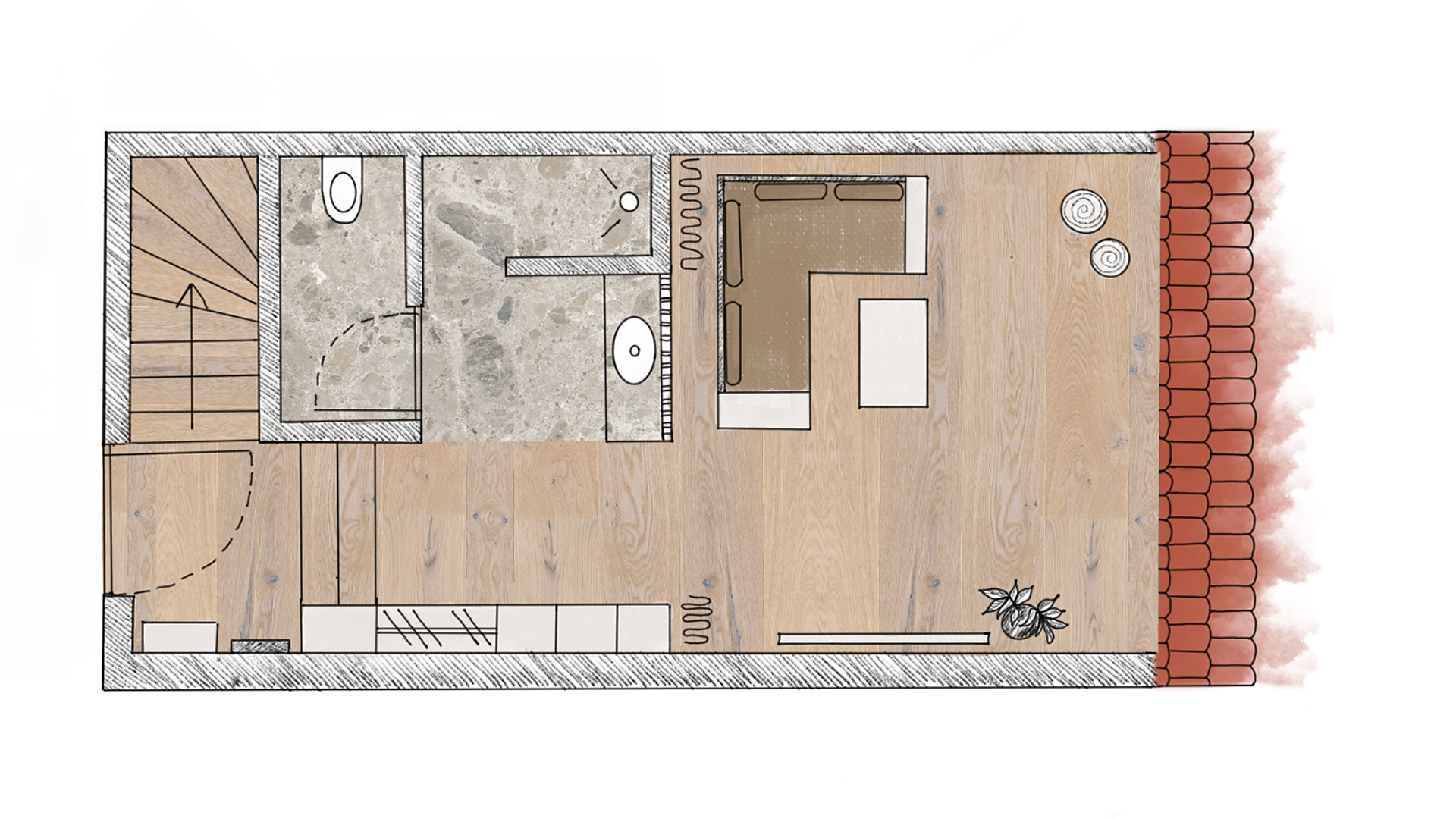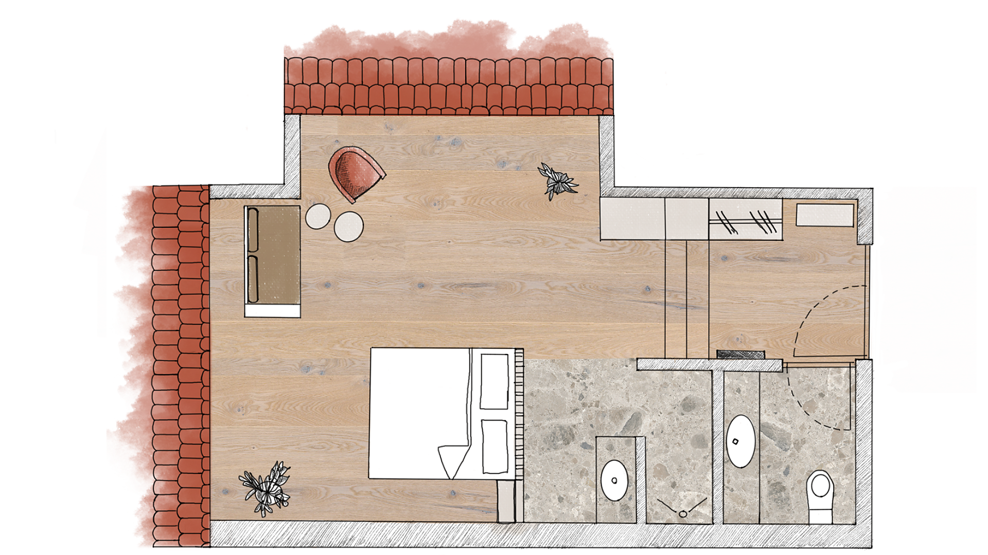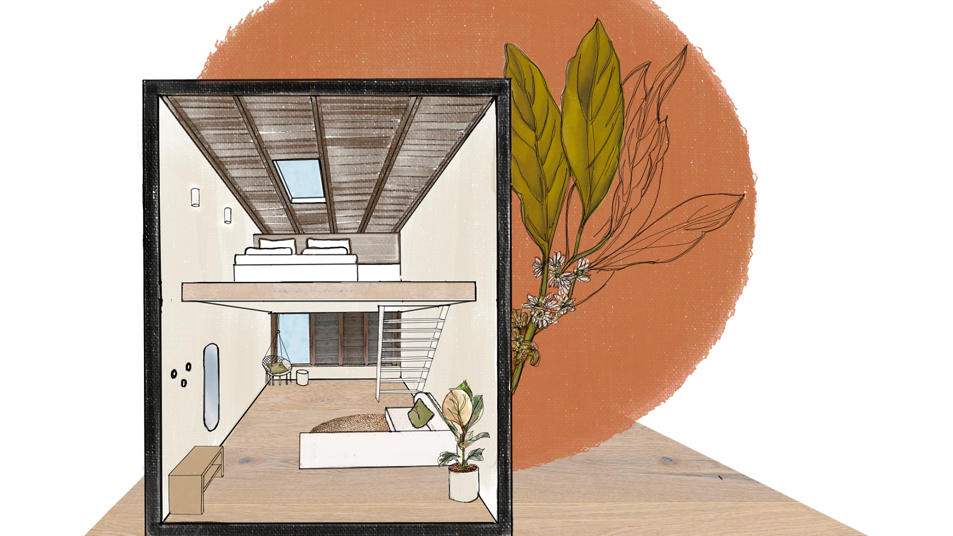 Camera su 2 livelli ideale per famiglie con più bambini; scala a libero accesso nella zona notte; letto matrimoniale per i genitori e alcova con letto per i bambini; zona bagno e zona giorno a vista con divano e sedia a dondolo.
