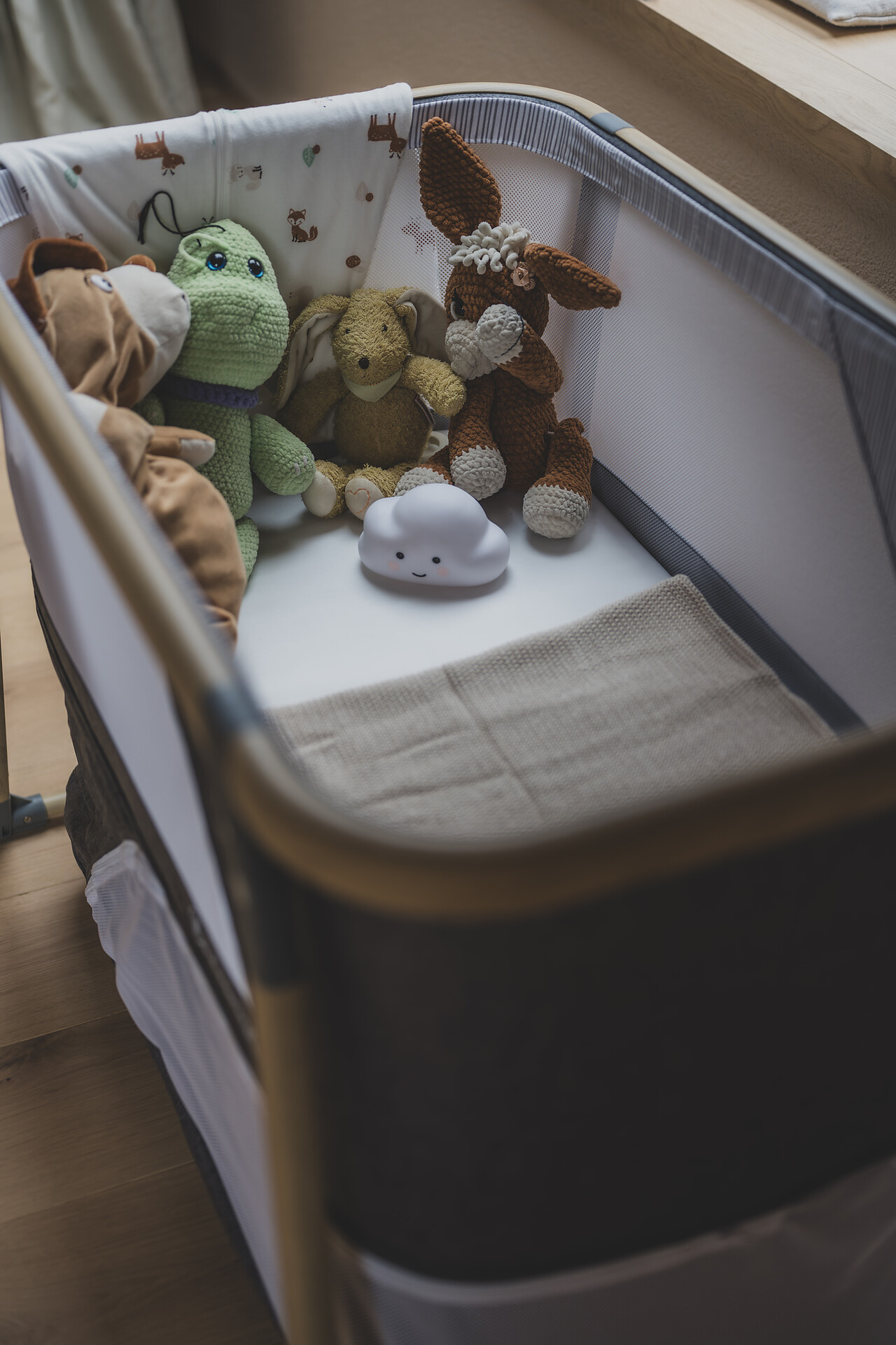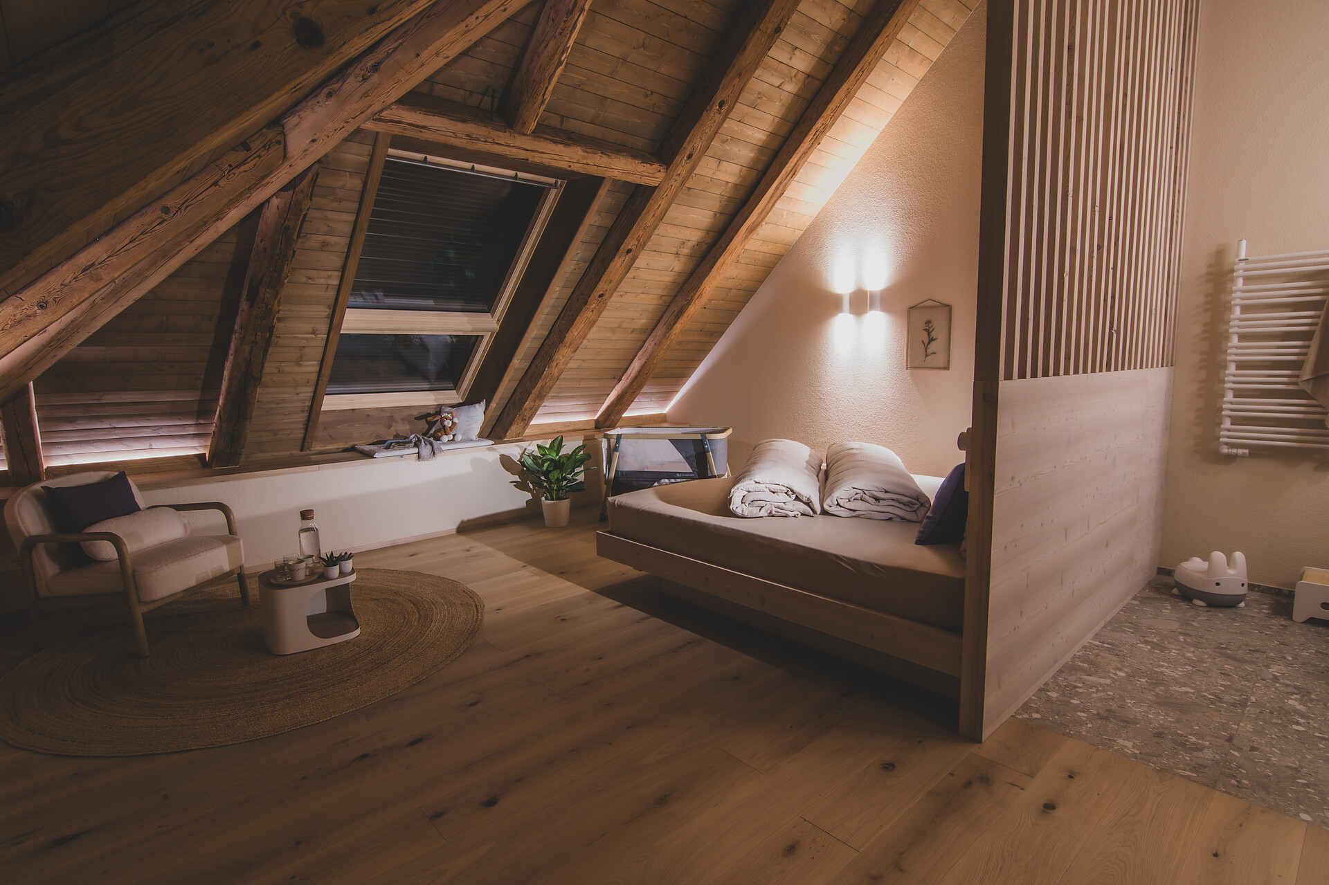 Camera su 2 livelli ideale per famiglie con bambini e neonati; galleria con letto matrimoniale, culla integrata e lettino in un'alcova separata; zona bagno a vista e zona giorno con divano e mobili da salotto.