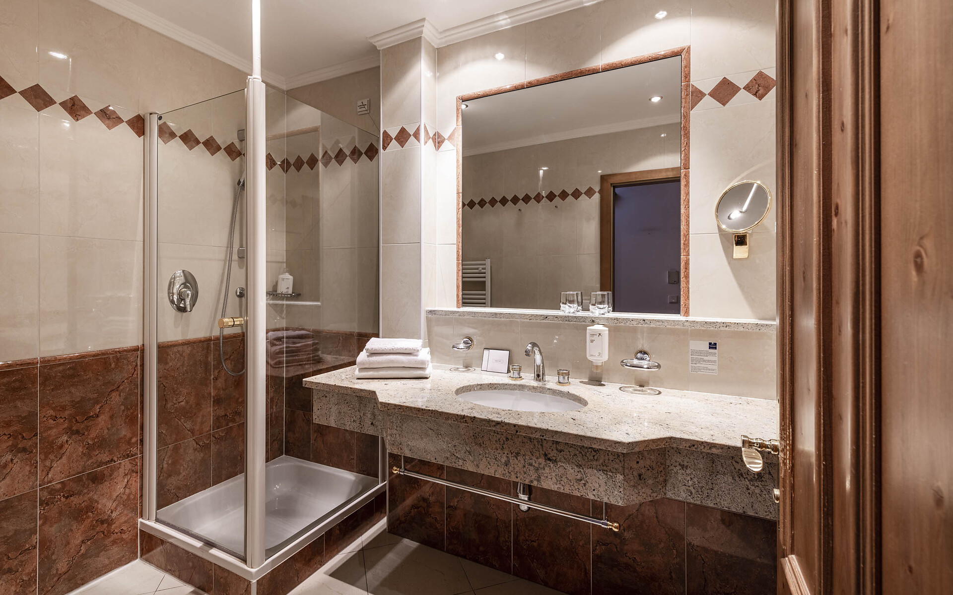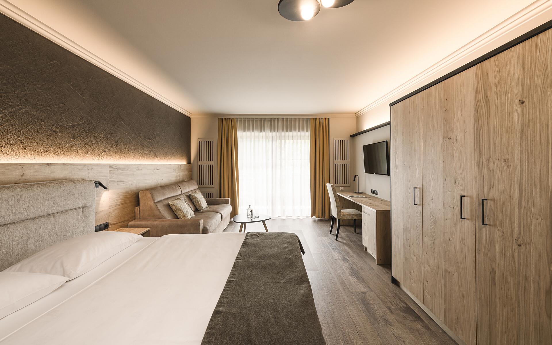 Il moderno mobilio alpino è composto in parte da: letto matrimoniale, divano, scrivania, telefono, TV con radio incorporata, minibar e cassaforte. Tutte le nostre camere doppie Gitschberg dispongono di pavimento in parquet e un bagno privato con doccia e WC (la maggior parte dispone anche di un bidet). Durante il soggiorno, gli ospiti disporranno di un asciugacapelli, dei cosmetici della linea di prodotti della nostra Acquapura SPA e di una borsa con tutto l'occorrente per rilassarsi nell'area benessere (accappatoio morbido, ciabattine e asciugamano). L'eccezionale panorama su cui si affacciano i nostri balconi completa l'esperienza del tuo soggiorno.
