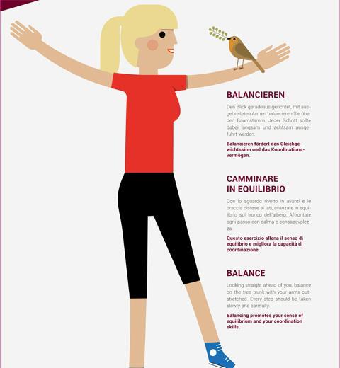 equilibrio su un tronco d’albero; questo esercizio rafforza il senso di equilibrio e la